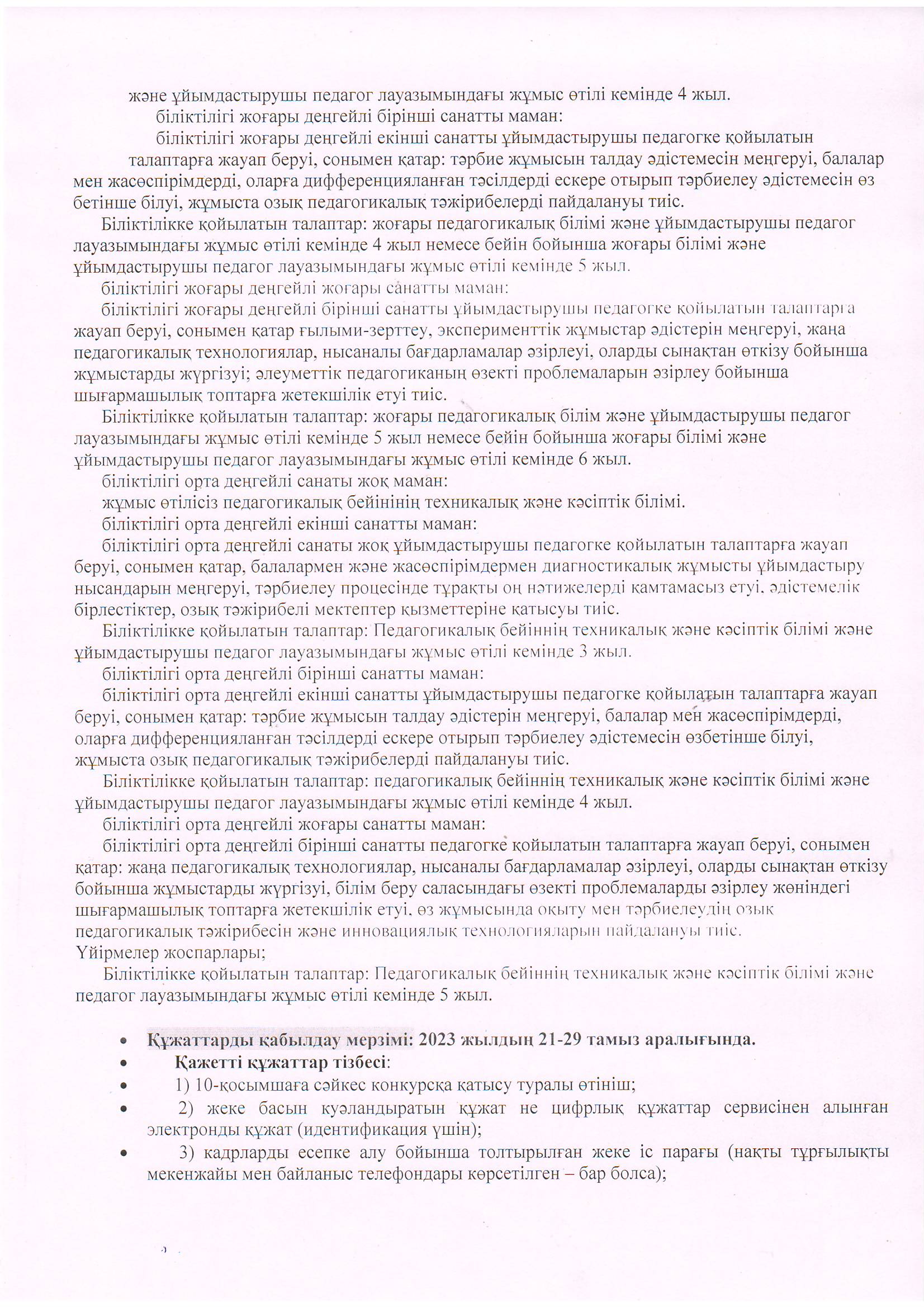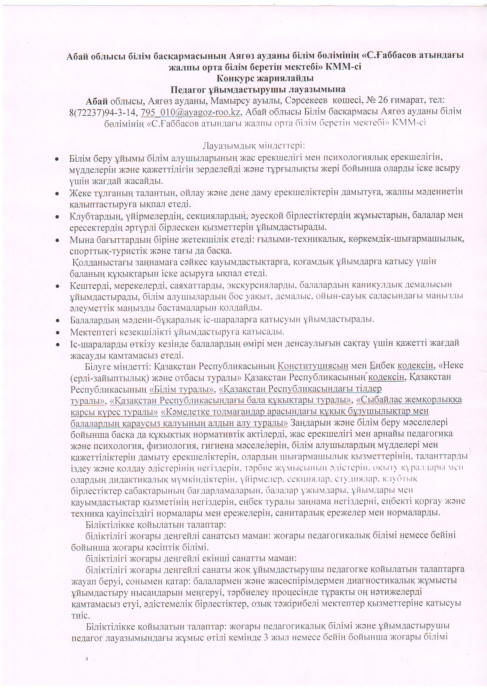 » Конкурс. Педагог ұйымдастырушы лауазымына