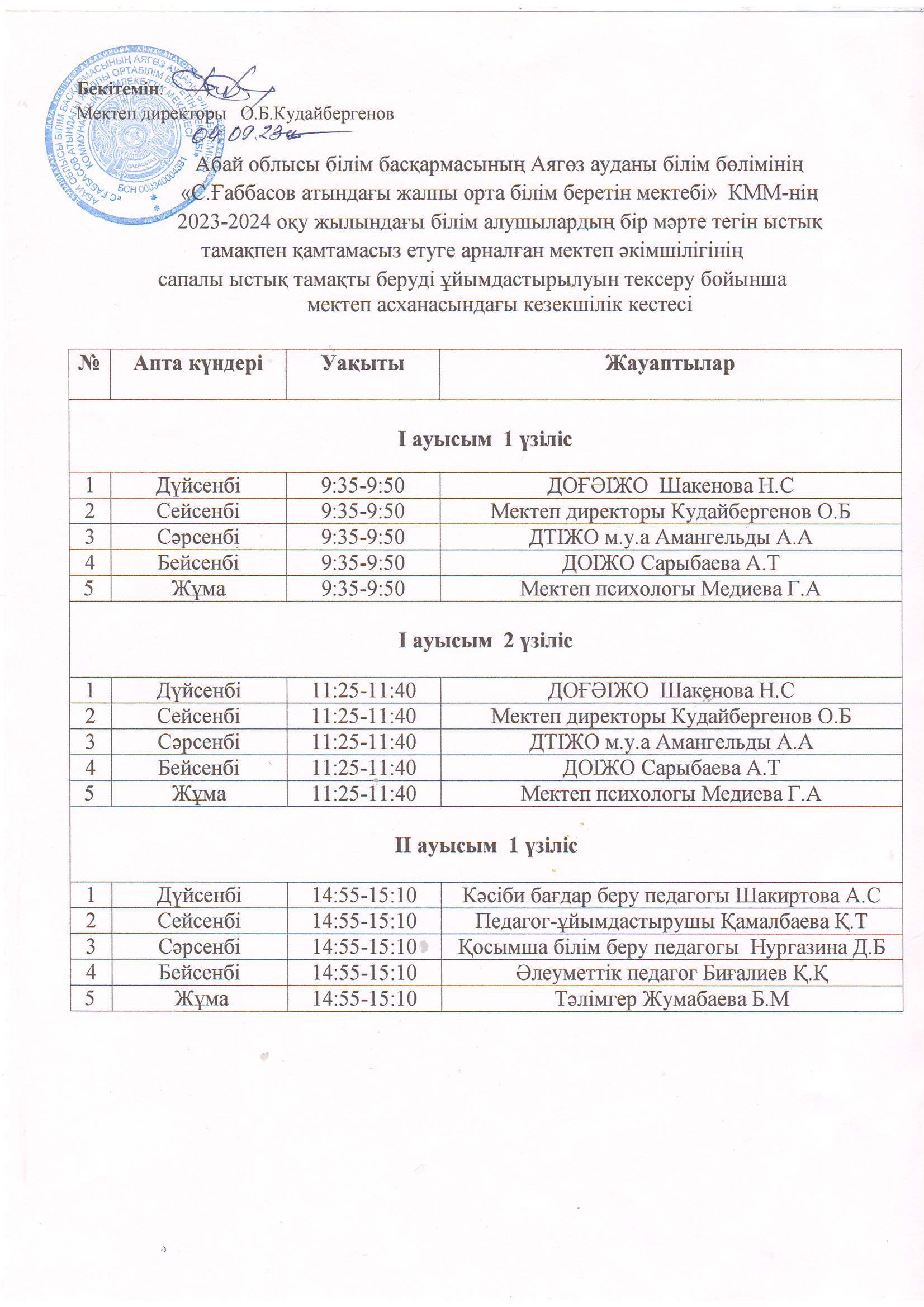 Мектеп сайты » Информация » 2023-2024 оқу жылындағы білім алушылардың бір мәрте тегін ыстық тамақпен қамтамасыз етуге арналған мектеп әкімшілігінің сапалы ыстық тамақты беруді ұйымдастырылуын тексеру бойынша мектеп асханасындағы кезекшілік кестесі