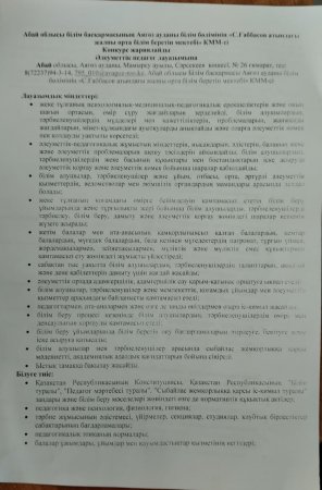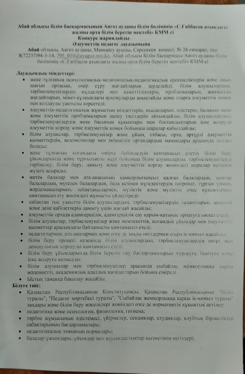 Мектеп сайты » Информация » Абай облысы білім басқармасының Аягөз ауданы білім бөлімінің "С.Ғаббасов атындағы жалпы орта білім беретін мектебі" КММ-сі Конкурс жариялайды. Әлеуметтік педагог лауазымына