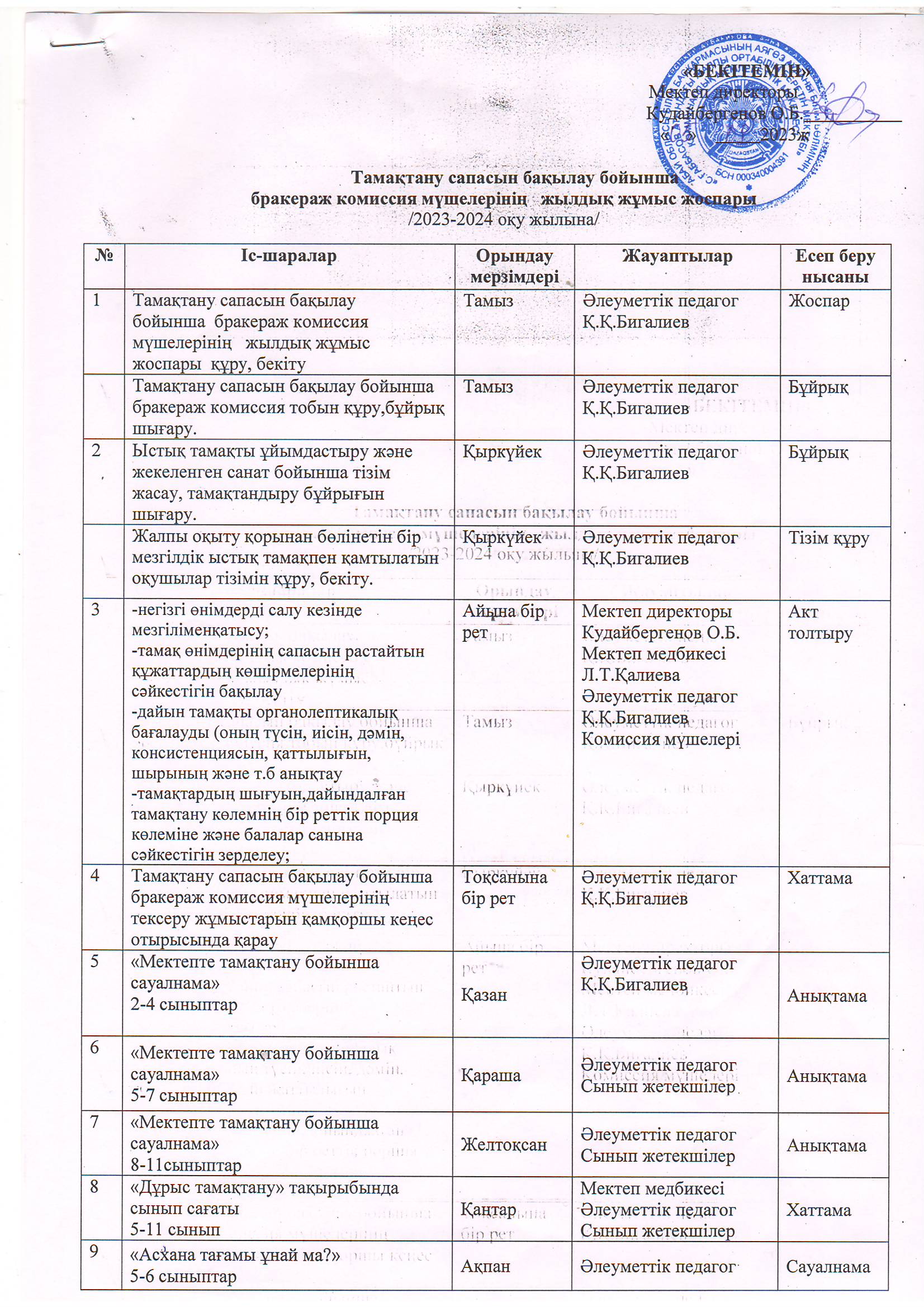 Бракераж комиссиясының 2023-2024 оқу жылындағы жылдық жоспары