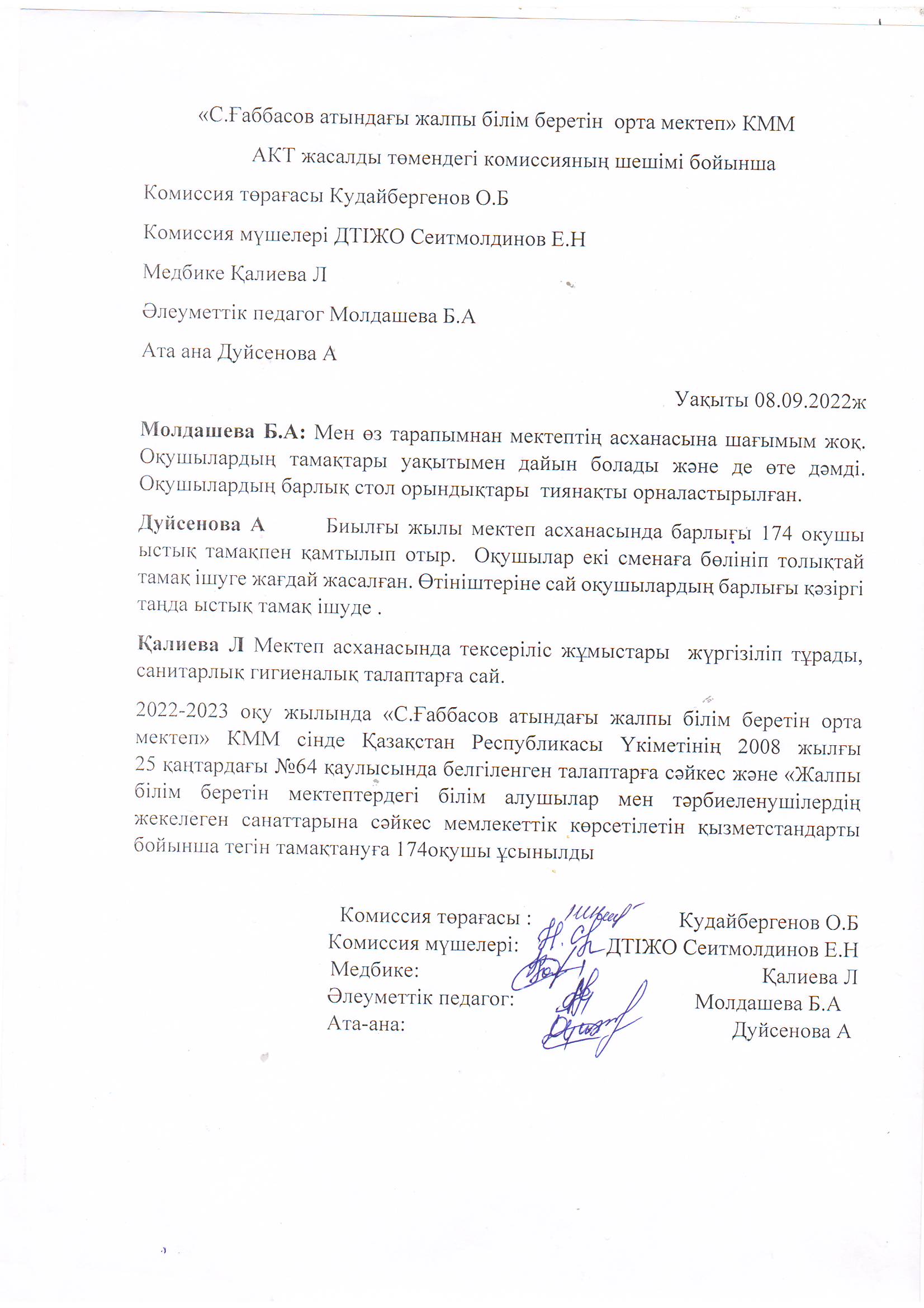 » 2022-2023 оқу жылындағы мектеп асханасына тексеру жасалып, акт жасау