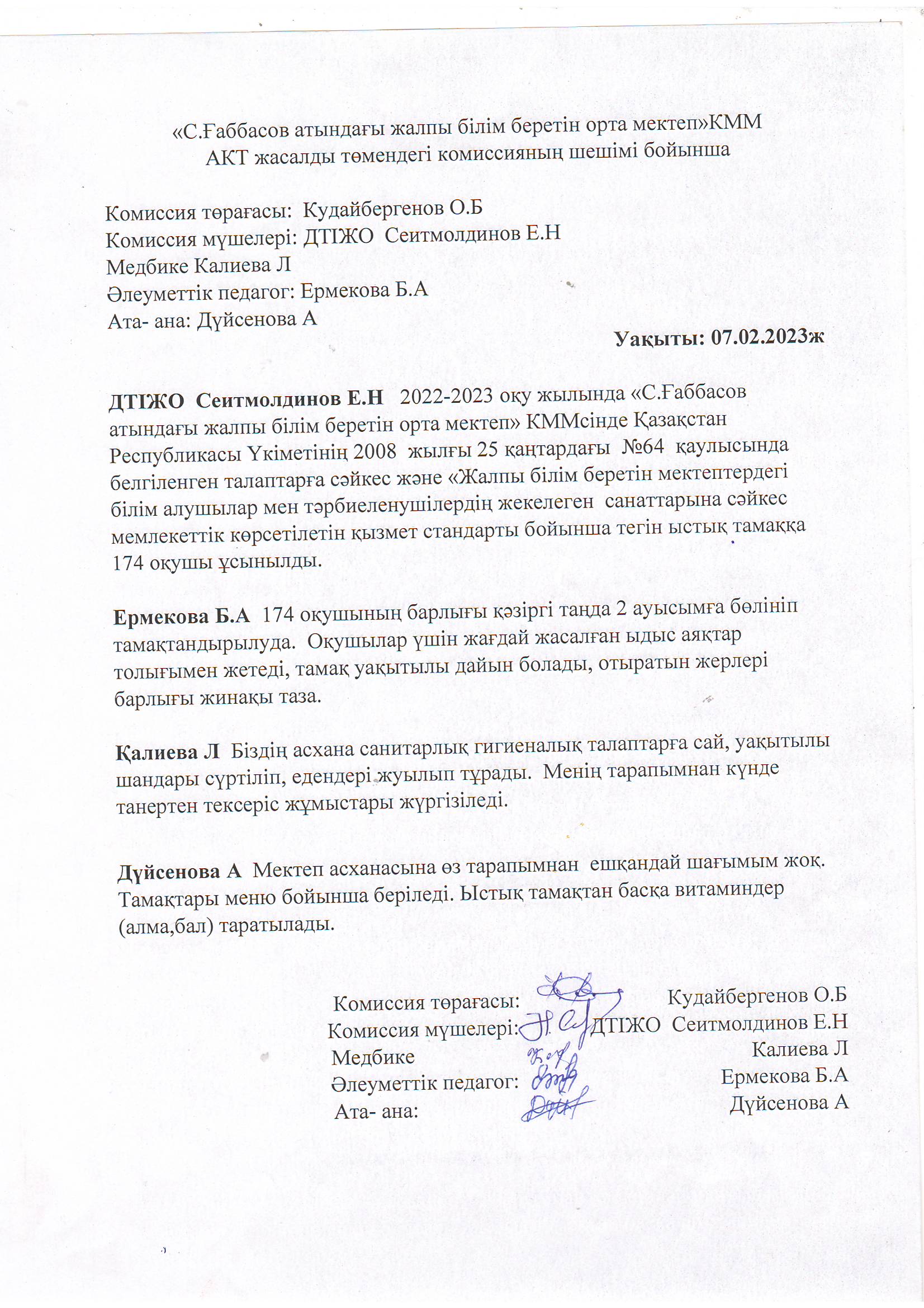 » 2022-2023 оқу жылындағы мектеп асханасына тексеру жасалып, акт жасау