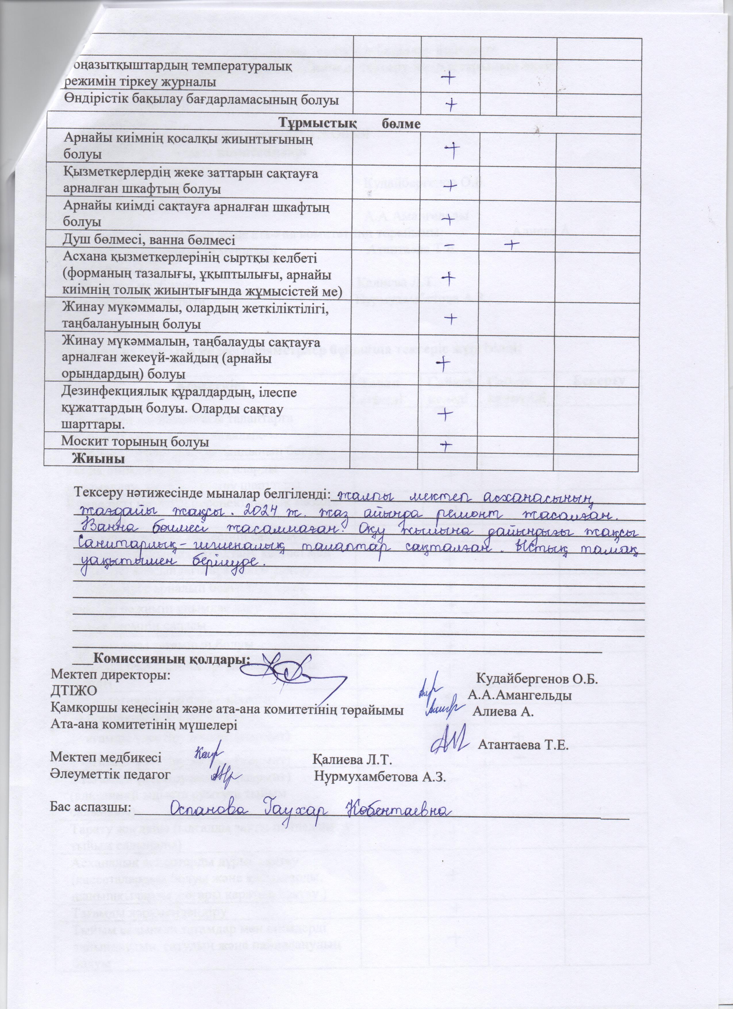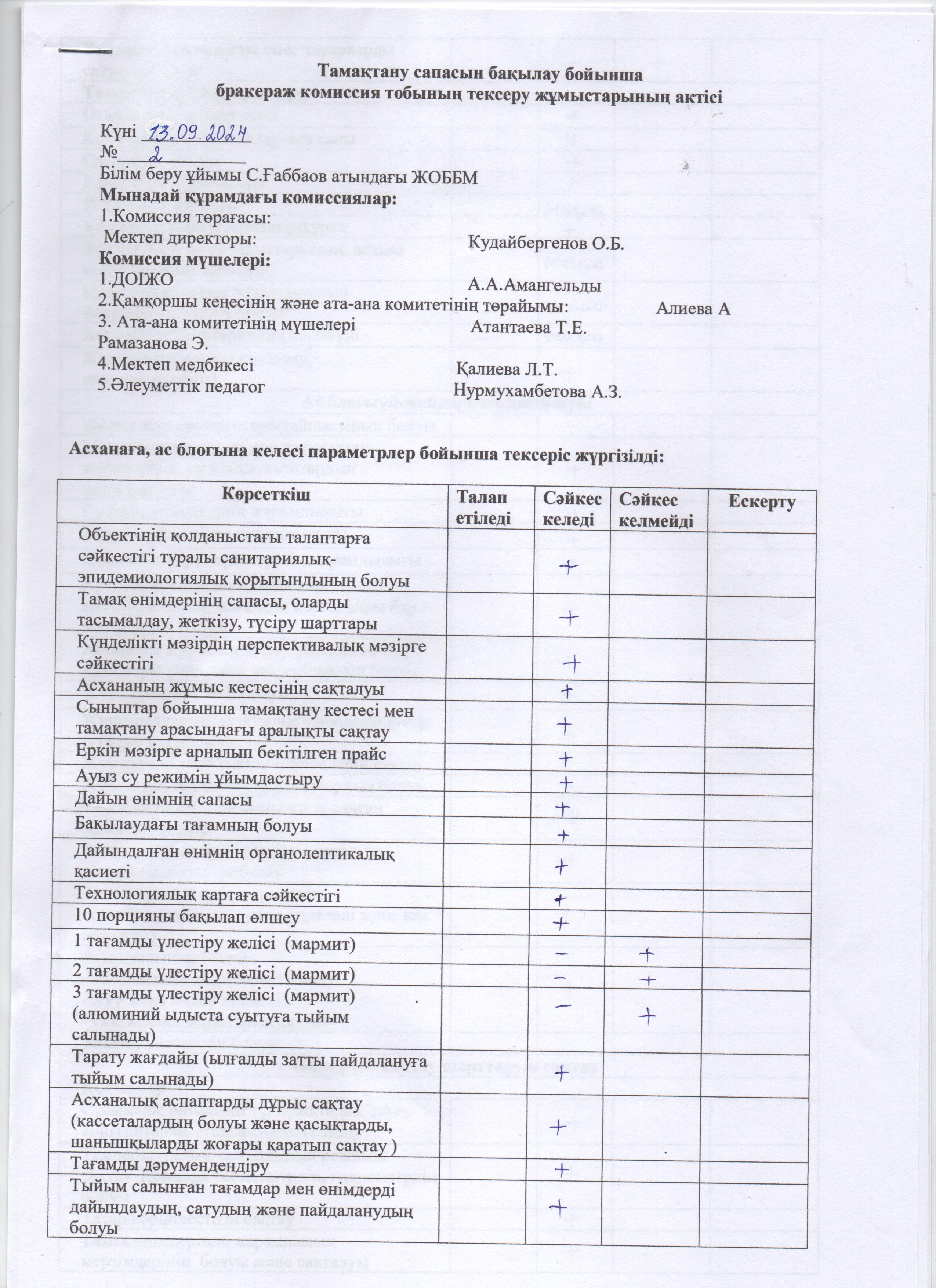 2024-2025 оқу жылындағы 13 қыркүйек күні тамақтану сапасын бақылау бойынша бракераж комиссия тобының тексеру жұмыстарына акт