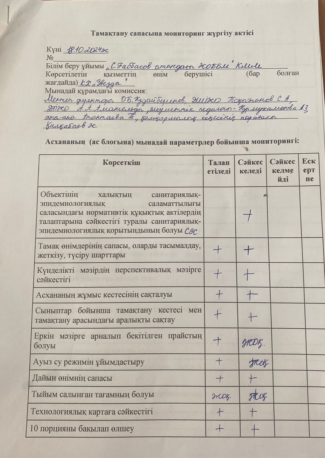 Бракераж комиссиясының тамақтану сапасын тексеру мониторинг актісі 2024 жылдың 18 қазан күні