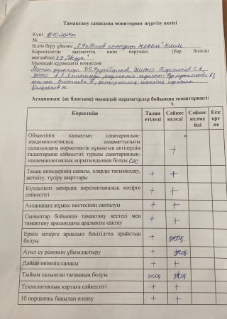 » Бракераж комиссиясының тамақтану сапасын тексеру мониторинг актісі 2024 жылдың 18 қазан күні