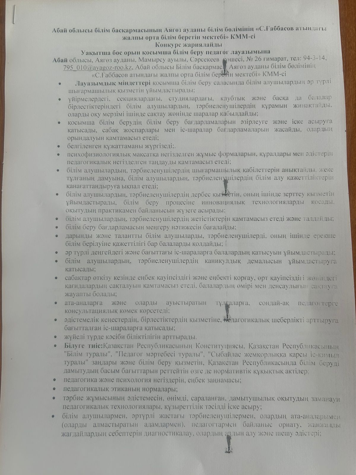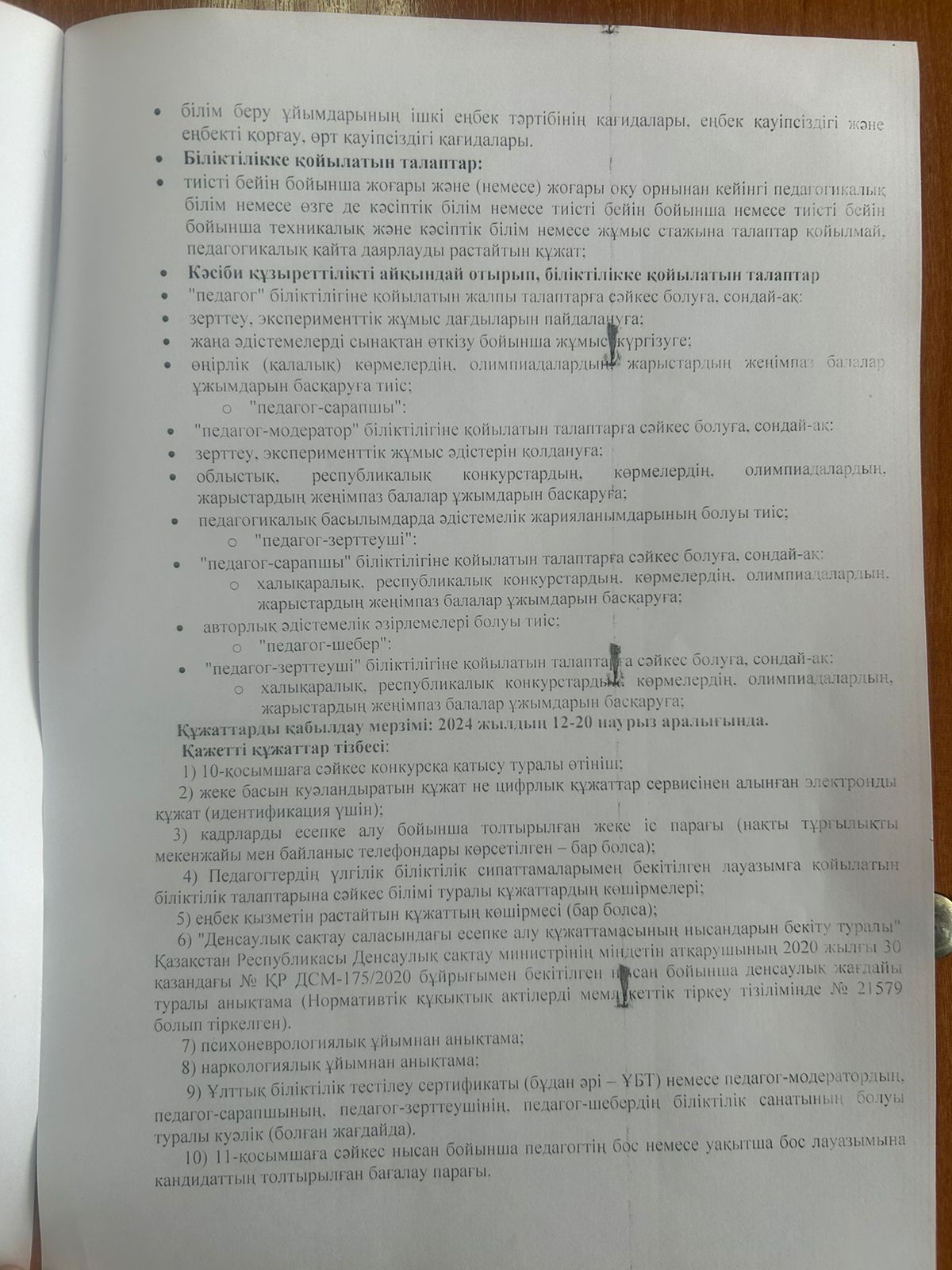 » Уақытша бос орын қосымша білім беру педагогына конкурс